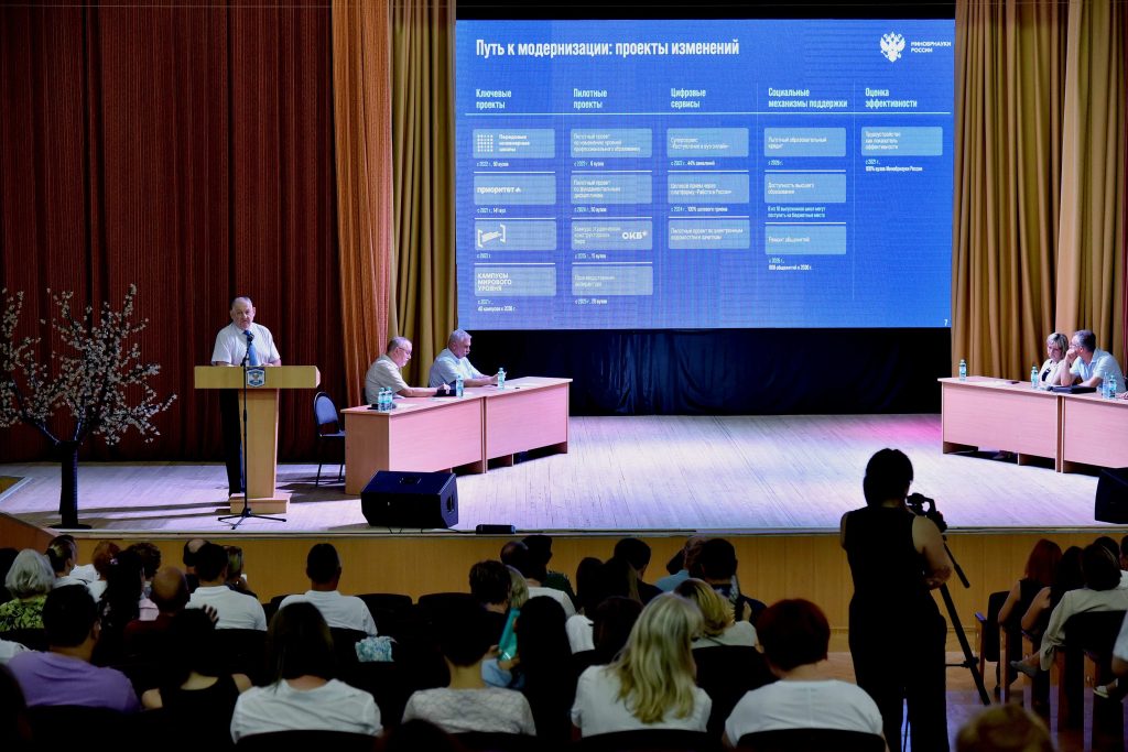 Ректор университета профессор А. П. Горбунов рассказал участникам собрания об основных принципах новой модели высшего образования, актуальных подходах к подготовке кадров под существующие и будущие потребности экономики региона в контексте выступления Министра науки и высшего образования России В. Н. Фалькова на окружном совещании вузов СКФО 12-13 июля в Пятигорске.
